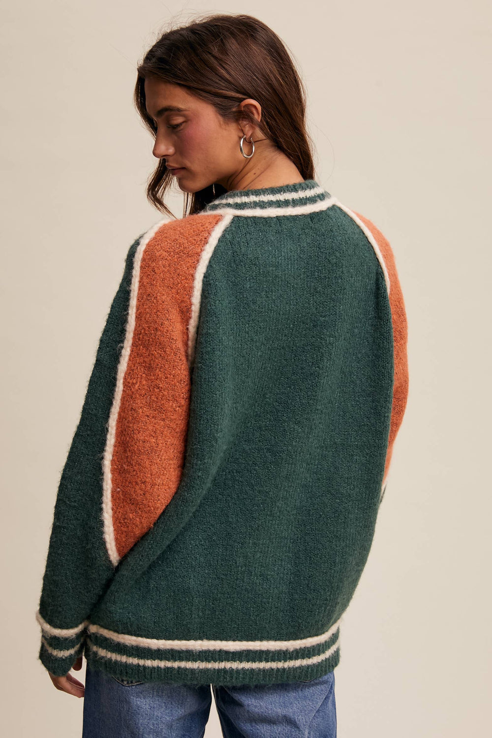 Meet the ultimate blend of cozy and cool. Our Varsity Bomber Jacket is a statement piece you'll want to wear all season long. Designed with a plush, fuzzy knit fabric, this jacket feels like a warm hug, while the bold colorblock sleeves and sporty varsity stripes give it a unique retro edge. The relaxed, oversized fit makes it perfect for layering over everything from a simple tee to a hoodie. It's the go-to piece for adding both warmth and style to any outfit.