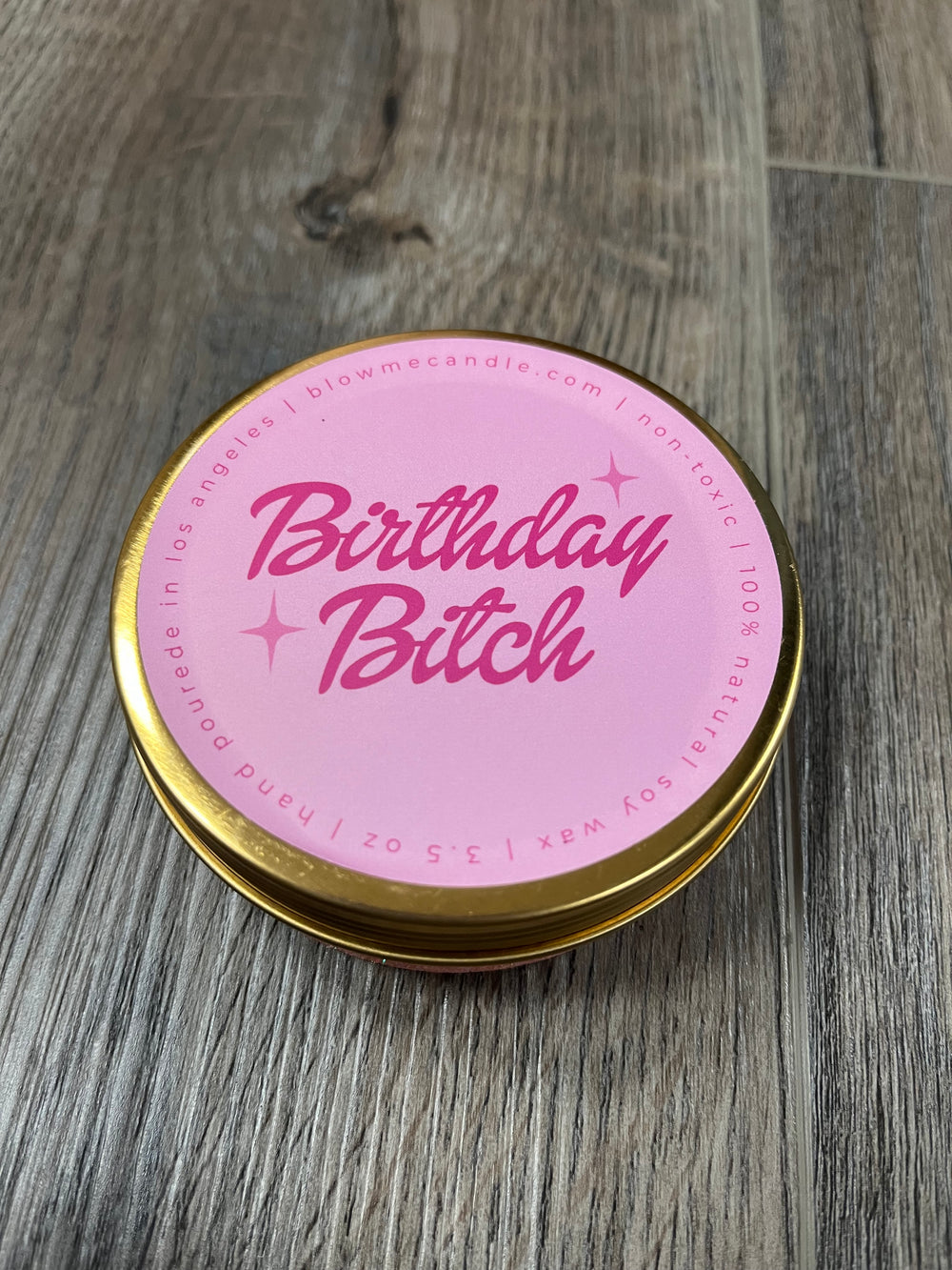 3.5 oz gold tin candle with a wood wick. Smells like pink cherry blossoms. 10-15 hour burn time.