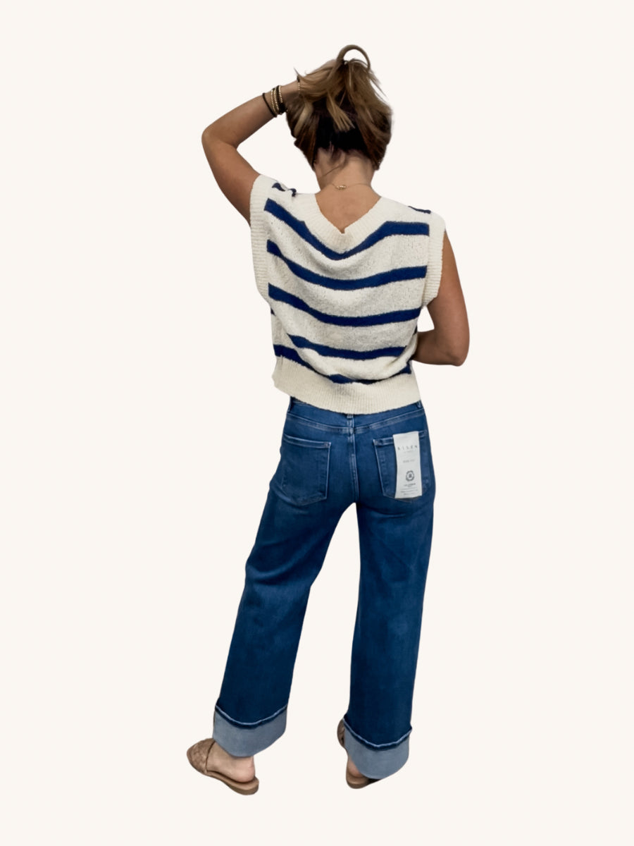 This breezy, striped knit vest is perfect for those warm spring and summer days. The lightweight, knit construction and horizontal stripes create a relaxed, retro-inspired look. The v-neckline and sleeveless design offer a cool and comfortable fit, making it perfect for layering over a tank top or t-shirt. Whether you're heading to the beach or running errands around town, this versatile vest is sure to become a go-to piece in your wardrobe.