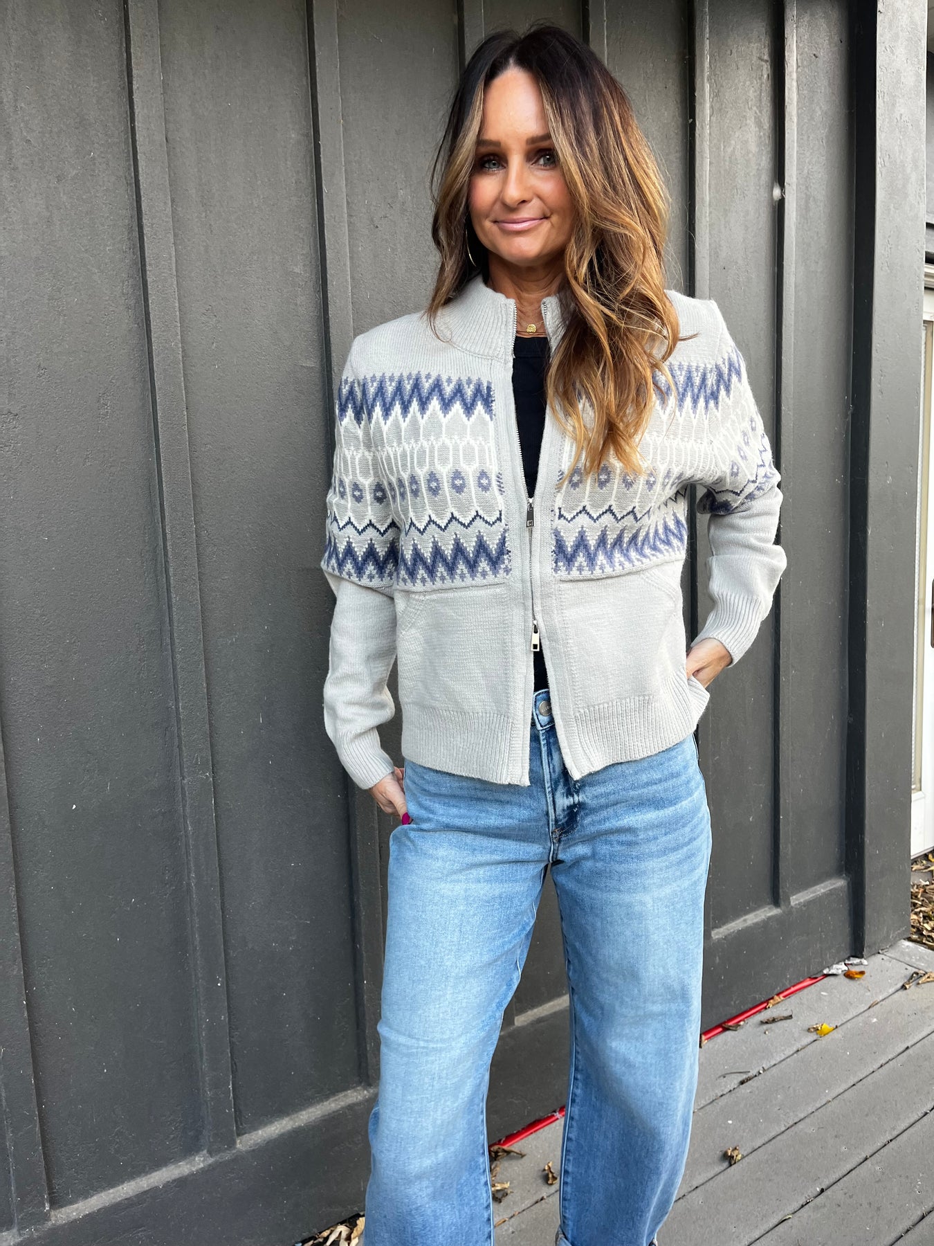 Get ready to feel the warmth and style! This Fair Isle Zip-Up Cardigan is the extra "oomph" your closet needs, blending stunning visual design with exceptional comfort. Crafted from a soft, cozy knit, this sweater features a classic, intricate Fair Isle design that's perfect for chilly days, holiday gatherings, or adding a stylish layer to your casual weekend wear. Nicole is wearing S.